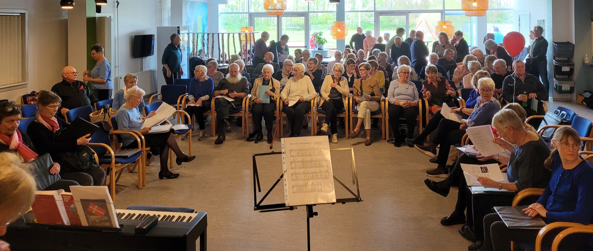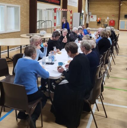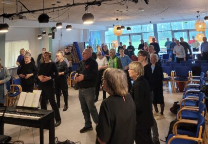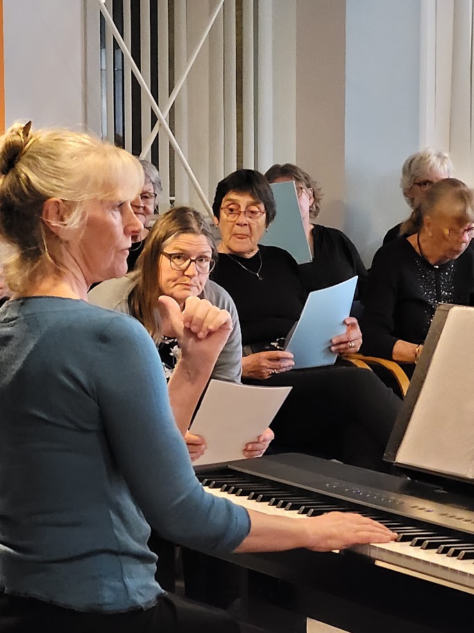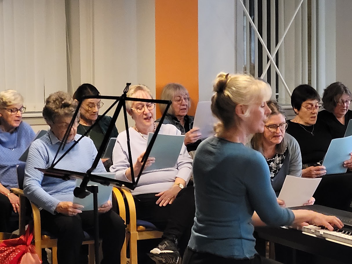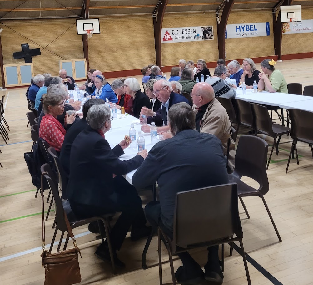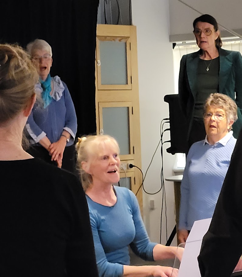 KORDAG 5 MAJ 2024 Så blev det 5 maj og vi skulle afholde vores kordag, hvor vi havde inviteret Tåsingekoret. Regnen stod ned, men alle overlevede turen fra bilen og ind i Skårup Kulturcenter. Vi startede kl. 11, hvor Zita varmede de 2 kor op. Herefter indøvede vi de to fællesnumre „Du spør´ mig om håbet‟ og „I morgen er der også en dag‟. Kl. 12.30 var der frokost i hallen. ( Uff der var kold) Bagefter var der generalprøve på opstilling og fællesnumre. Så var der kaffepause med kage og nu skinnede solen fra en skyfri himmel . Kl. 15 stod vi parat til at give koncert. Tåsingekoret lagde ud med en flot fødselsdagssang til Gudmekoret og tre andre sange. Så optrådte vi med fællesnumrene og Gudmekoret sluttede af med deres fem numre. En rigtig god koncert, som jeg er sikker på, de over 100 fremmødte publikummer nød. Herunder kan i se og høre indslag fra dagen