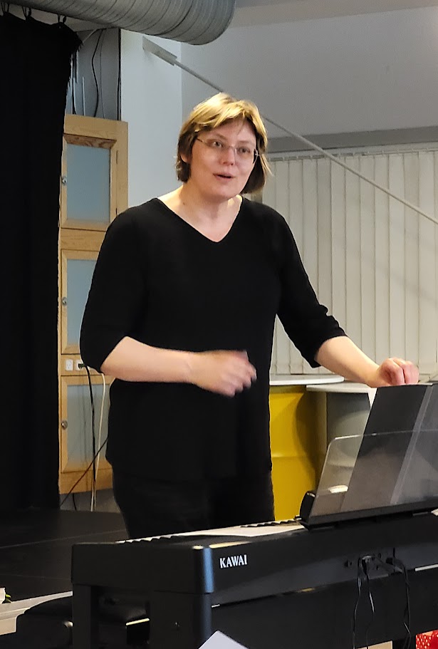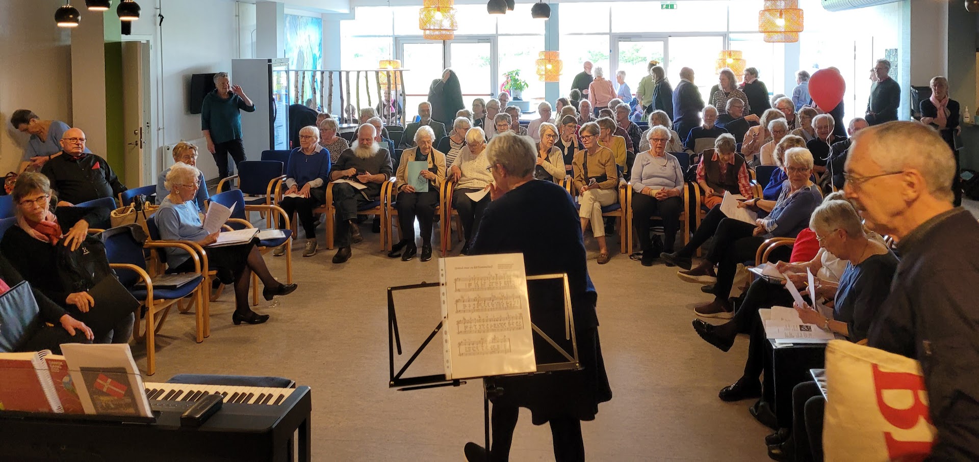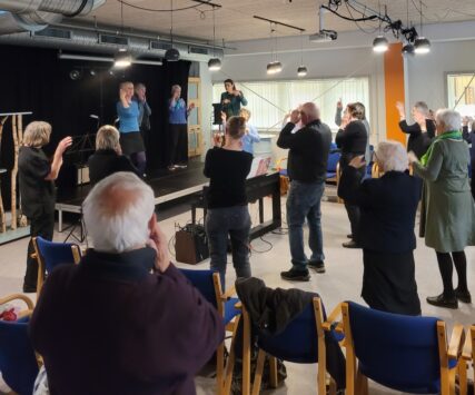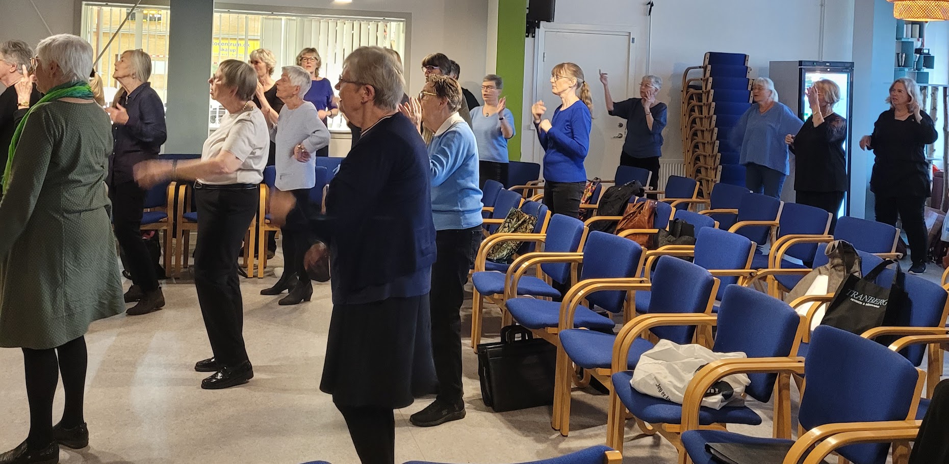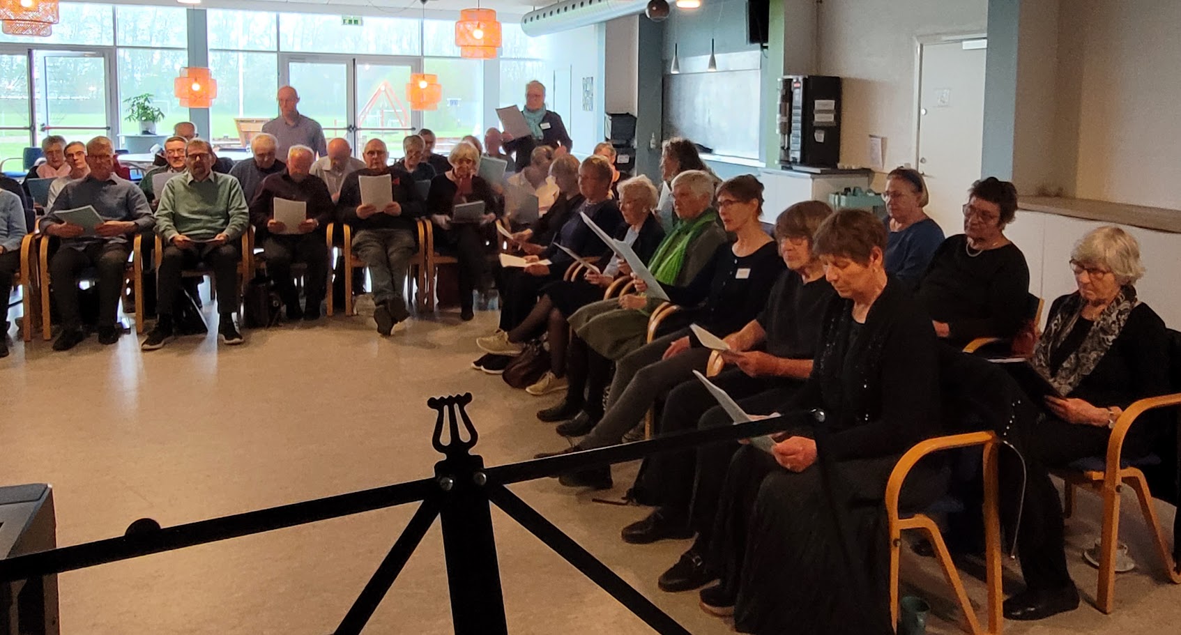 KORDAG 5 MAJ 2024 Så blev det 5 maj og vi skulle afholde vores kordag, hvor vi havde inviteret Tåsingekoret. Regnen stod ned, men alle overlevede turen fra bilen og ind i Skårup Kulturcenter. Vi startede kl. 11, hvor Zita varmede de 2 kor op. Herefter indøvede vi de to fællesnumre „Du spør´ mig om håbet‟ og „I morgen er der også en dag‟. Kl. 12.30 var der frokost i hallen. ( Uff der var kold) Bagefter var der generalprøve på opstilling og fællesnumre. Så var der kaffepause med kage og nu skinnede solen fra en skyfri himmel . Kl. 15 stod vi parat til at give koncert. Tåsingekoret lagde ud med en flot fødselsdagssang til Gudmekoret og tre andre sange. Så optrådte vi med fællesnumrene og Gudmekoret sluttede af med deres fem numre. En rigtig god koncert, som jeg er sikker på, de over 100 fremmødte publikummer nød. Herunder kan i se og høre indslag fra dagen